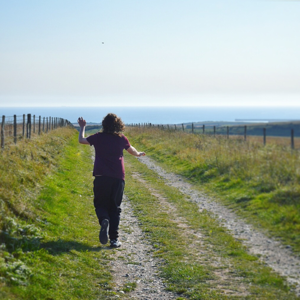 [Picture description: A boy in his early teens, facing away from us, running down a path in the countryside with wide views and the sea on the horizon. His arms happily flapping in different directions.]